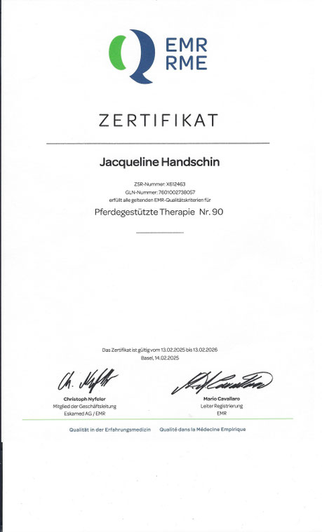 Ich absolviere fortlaufend die notwendigen EMR-Weiterbildungen und bin seit 2017 EMR anerkannt bei vielen Zusatzversicherungen der Krankenkassen. Im weiteren bin ich Mitglied im Verband SG-TR (Schweizer Gruppe Therapeutisches Reiten www.sgtr.ch) und PI-CH (Pferdegestützte Interventionen Schweiz www.pt-ch.ch).